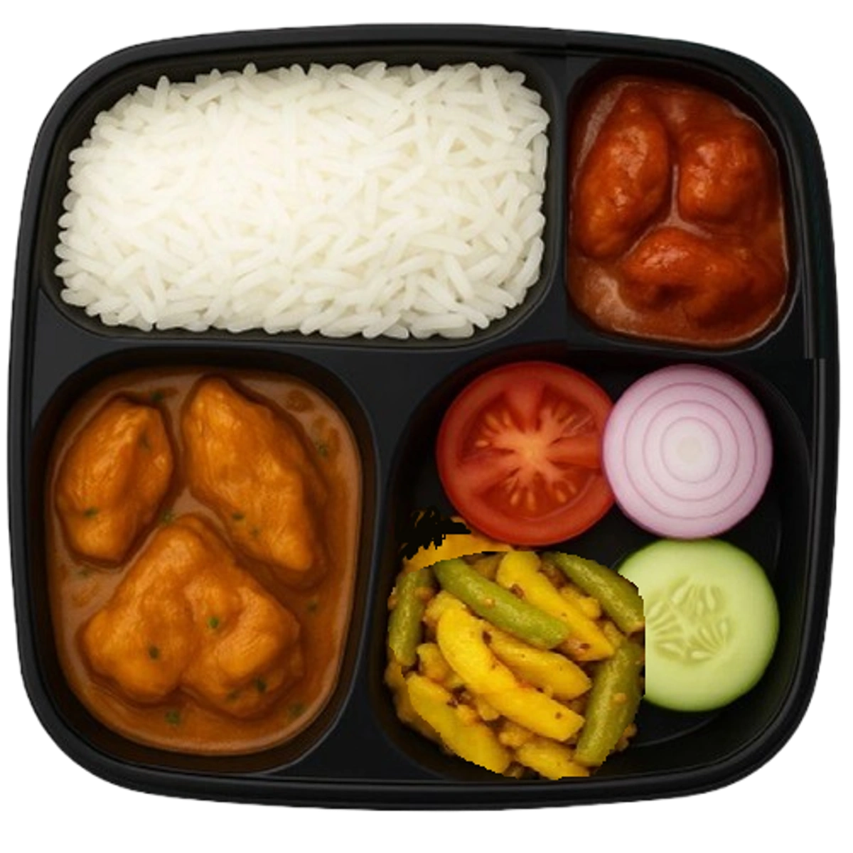 Chicken Curry, Bhaji, Salad, Pickle, Rice Meal