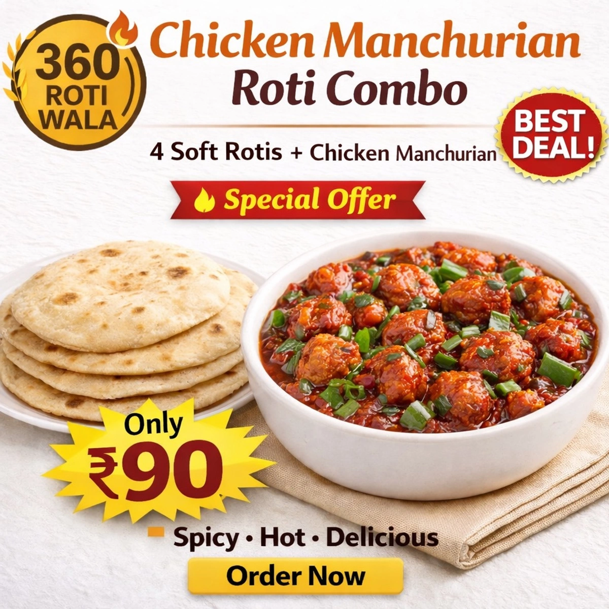 Indulge in the irresistible combination of classic Indian bread and bold, savory Asian flavors with the Chicken Manchurian + 4 Soft Rotis from 360 ROTI WALA. This dish is crafted to perfection, delivering the ultimate balance of taste, texture, and satisfaction in every bite. Whether you're craving a hearty meal or looking to explore fusion cuisine, this offering is sure to delight your palate.