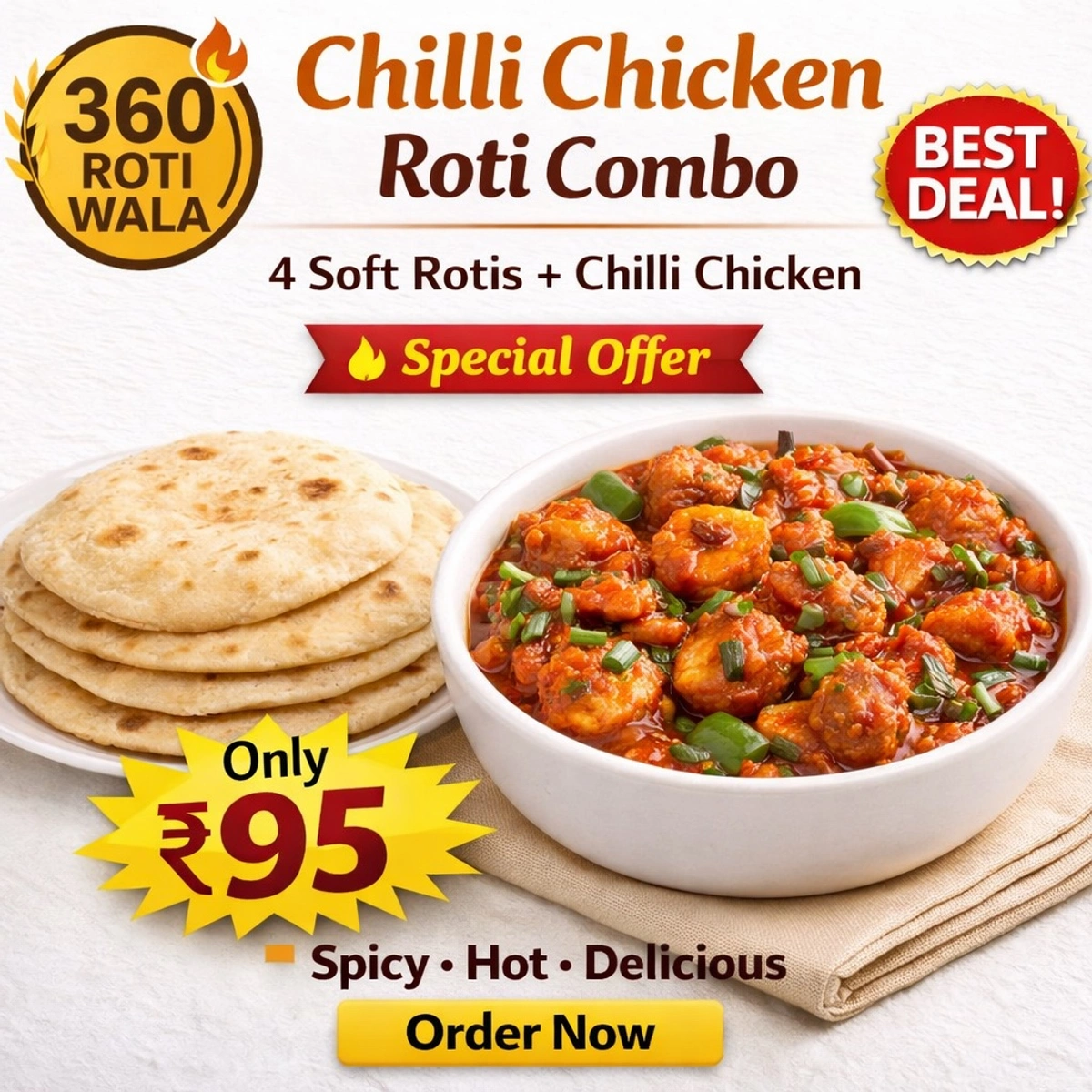 Craving a perfect blend of spice and comfort? 360 ROTI WALA brings you the irresistible Chilli Chicken + 4 Soft Rotis, a culinary masterpiece that combines bold flavors with the warmth of freshly made rotis. Perfect for lunch, dinner, or a special treat, this combo is crafted to satisfy your taste buds and leave you wanting more.