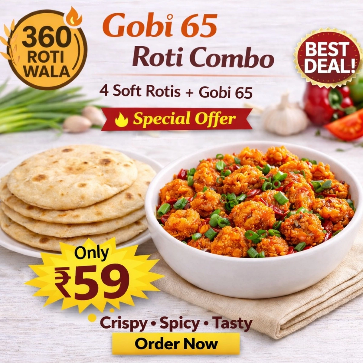 Whether you're looking for a wholesome meal or a quick indulgence, Gobi 65 + 4 Soft Rotis is your go-to choice for authentic, flavorful satisfaction. Made with love and care, this dish is crafted to leave you smiling with every bite.