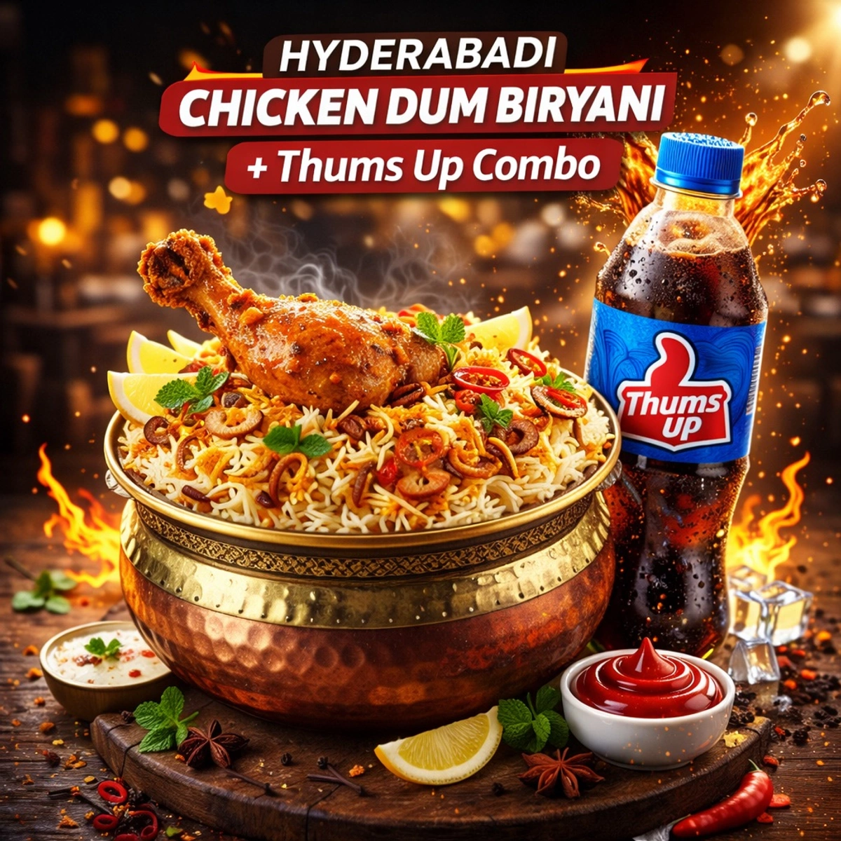 Don’t wait! Order your Hydrabadi Chicken Dum Biryani + ThumsUp combo now and savor the taste of tradition with a refreshing twist. Click the button below to place your order today!