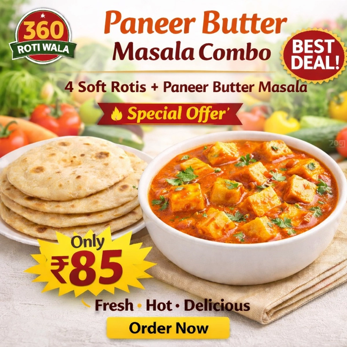 Order now from 360 ROTI WALA and savor the irresistible taste of Paneer Butter Masala + 4 Soft Rotis. Your perfect meal is just a click away!