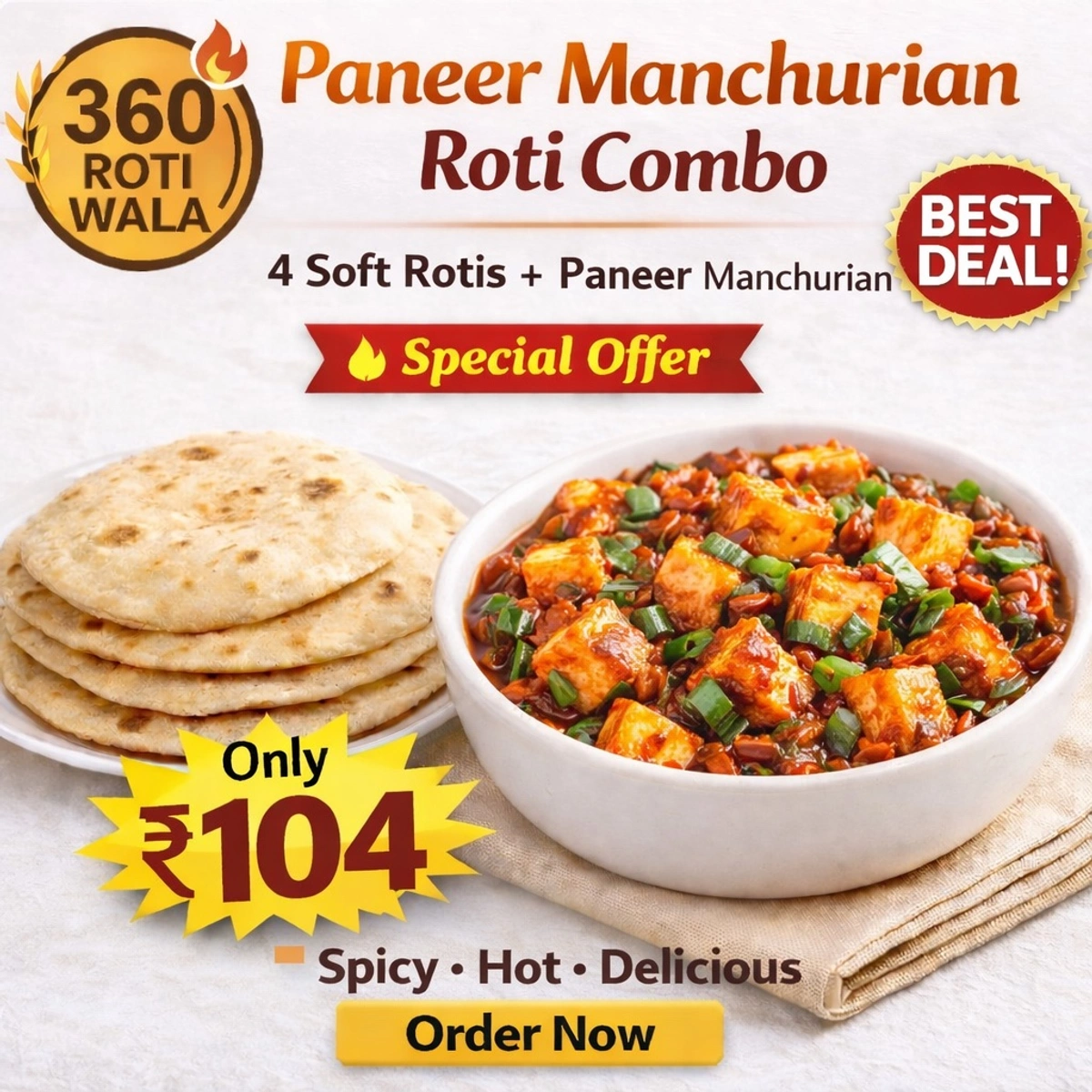 - Soft Rotis: Four freshly made, soft rotis that complement the Paneer Manchurian perfectly, offering a traditional touch to this fusion meal.